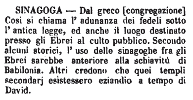 | Sinagoga - S. f. Gr. Συναγωγή. L'adunanza dei dottori appresso gli Ebrei sotto l'antica legge. (Fanf.) [G.M.] Magri, Notiz. Vocab. Eccl. Così chiamano (Sinagoga) gli Ebrei il luogo ove si radunano a fare orazione, e predicare la legge mosaica; oggi detta comunemente Scuola. Talora significa la Repubblica ebrea, come Chiesa (da ἐκκαλέω) i Cristiani cattolici.