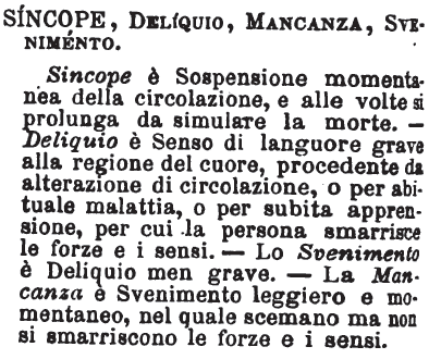 | Sincope, Deliquio, Mancanza, Svenimento - Sincope è Sospensione momentanea della circolazione, e alle volte si prolunga da simulare la morte. - Deliquio è Senso di languore grave alla regione del cuore, procedente da alterazione di circolazione, o per abituale malattia, o per subita apprensione, per cui la persona smarrisce le forze e i sensi. - Lo Svenimento è Deliquio men grave. - La Mancanza è Svenimento leggiero e momentaneo, nel quale scemano ma non si smarriscono le forze e i sensi. [immagine] |