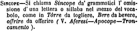 | Sincope - Si chiama Sincope da' grammatici l'omissione d'una lettera o sillaba nel mezzo del vocabolo, come in Torre da togliere, Bere da bevere, offrire da offerire (V. Aferesi - Apocope - Troncamento). [immagine] |