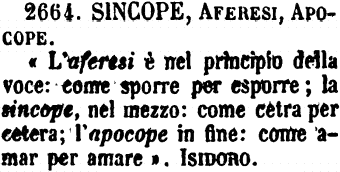 | Sincope, Aferesi, Apocope - «L'aferesi è nel principio della voce: come sporre per esporre; la sincope, nel mezzo: come cetra per cetera; l'apocope in fine: come amar per amare». Isidoro. [immagine] |