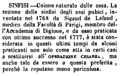 | Sinfisi - Unione naturale delle ossa. La sezione della sinfisi degli ossi pubici, inventata nel 1768 da Siguad de Lafond, medico della Facoltà di Parigi, membro dell'Accademia di Digione, e da esso praticata con ottimo successo nel 1777, è stata considerata in questi ultimi tempi da alcuni praticanti non solo come atta in certi casi a sostituirsi all'operazione cesarea, ma anche tale da essere a questa preferita, perchè la reputano meno pericolosa. [immagine] |