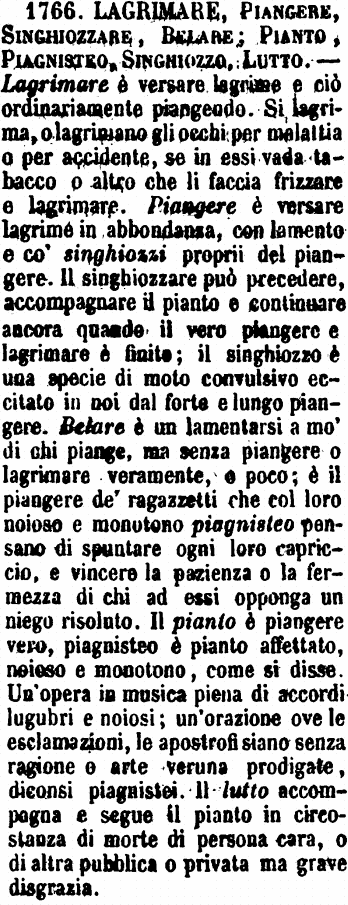 | Lagrimare, Piangere, Singhiozzare, Belare; Pianto, Piagnisteo, Singhiozzo, Lutto - Lagrimare è versare lagrime e ciò ordinariamente piangendo. Si lagrima, o lagrimano gli occhi per malattia o per accidente, se in essi vada tabacco o altro che li faccia frizzare e lagrimare. Piangere è versare lagrime in abbondanza, con lamento e co' singhiozzi proprii del piangere. Il singhiozzare può precedere, accompagnare il pianto e continuare ancora quando il vero piangere e lagrimare è finito; il singhiozzo è una specie di moto convulsivo eccitato in noi dal forte e lungo piangere. Belare è un lamentarsi a mo' di chi piange, ma senza piangere o lagrimare veramente, e poco; è il piangere de' ragazzetti che col loro noioso e monotono piagnisteo pensano di spuntare ogni loro capriccio, e vincere la pazienza o la fermezza di chi ad essi opponga un niego risoluto. Il pianto è piangere vero, piagnisteo è pianto affettato, noioso e monotono, come si disse. Un'opera in musica piena di accordi lugubri e noiosi; un'orazione ove le esclamazioni, le apostrofi siano senza ragione o arte veruna prodigate, diconsi piagnistei. Il lutto accompagna e segue il pianto in circostanza di morte di persona cara, o di altra pubblica o privata ma grave disgrazia. [immagine] |
