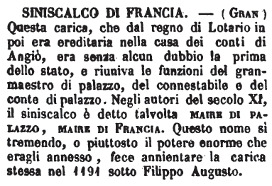 | Siniscalco di francia - (Gran) Questa carica, che dal regno di Lotario in poi era ereditaria nella casa dei conti di Angiò, era senza alcun dubbio la prima dello stato, e riuniva le funzioni del granmaestro di palazzo, del connestabile e del conte di palazzo. Negli autori del secolo XI, il siniscalco è detto talvolta maire di palazzo, maire di Francia. Questo nome si tremendo, o piuttosto il potere enorme che eragli annesso, fece annientare la carica stessa nel 1191 sotto Filippo Augusto. [immagine] |