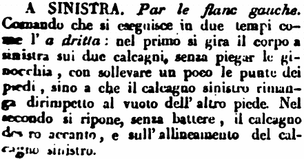 | A sinistra - Par le flanc gauche. Comando che si eseguisce in due tempi come l'a dritta: nel primo si gira il corpo a sinistra sui due calcagni, senza piegar le ginocchia, con sollevare un poco le punte dei piedi, sino a che il calcagno sinistro rimanga dirimpetto al vuoto dell'altro piede. Nel secondo si ripone, senza battere, il calcagno destro accanto, e sull'allineamento del calcagno sinistro. [immagine] |