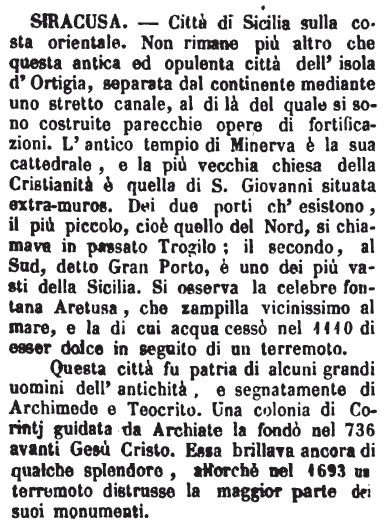 | Siracusa - Città di Sicilia sulla costa orientale. Non rimane più altro che questa antica ed opulenta città dell'isola d'Ortigia, separata dal continente mediante uno stretto canale, al di là del quale si sono costruite parecchie opere di fortificazioni. L'antico tempio di Minerva è la sua cattedrale, e la più vecchia chiesa della Cristianità è quella di S.Giovanni situata extra-muros. Dei due porti ch'esistono, il più piccolo, cioè quello del Nord, si chiamava in passato Trogilo; il secondo, al Sud, detto Gran Porto, è uno dei più vasti della Sicilia. Si osserva la celebre fontana Aretusa, che zampilla vicinissimo al mare, e la di cui acqua cessò nel 1110 di esser dolce in seguito di un terremoto.