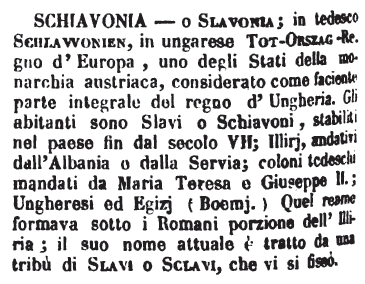 | Schiavonia o Slavonia - in tedesco Schlawonien, in ungarese Tot-Orszag - Regno d'Europa, uno degli Stati della monarchia austriaca, considerato come faciente parte integrale del regno d'Ungheria. Gli abitanti sono Slavi o Schiavoni, stabiliti nel paese fin dal secolo VII; Illirj, andativi dall'Albania e dalla Servia; coloni tedeschi mandati da Maria Teresa e Giuseppe II.; Ungheresi ed Egizj (Boemj). Quel reame formava sotto i Romani porzione dell'Illiria; il suo nome attuale è tratto da una tribù di Slavi o Sclavi, che vi si fissò. [immagine] |