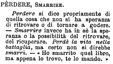 | Perdere, Smarrire - Perdere si dice propriamente di quella cosa che non si ha speranza di ritrovare o di tornare a godere. - Smarrire invece ha in sé la speranza o la possibilità del ritrovare, del ricuperare. Perdè la vita nella battaglia, ma certo non si direbbe smarrì. - « Ho smarrito quel libro, ma appena lo trovo, te lo mando. » [immagine] |