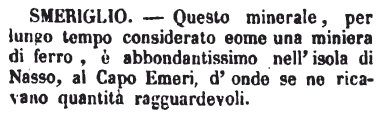 | Smeriglio - Questo minerale, per lungo tempo considerato come una miniera di ferro, è abbondantissimo nell'isola di Nasso, al Capo Emeri, d'onde se ne ricavano quantità ragguardevoli. [immagine] |