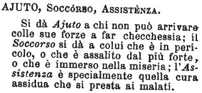 | Ajuto, Soccorso, Assistenza - Si dà Ajuto a chi non può arrivare colle sue forze a far checchessia; il Soccorso si dà a colui che è in pericolo, o che è assalito dal più forte, o che è immerso nella miseria; l'Assistenza è specialmente quella cura assidua che si presta ai malati. [immagine] |