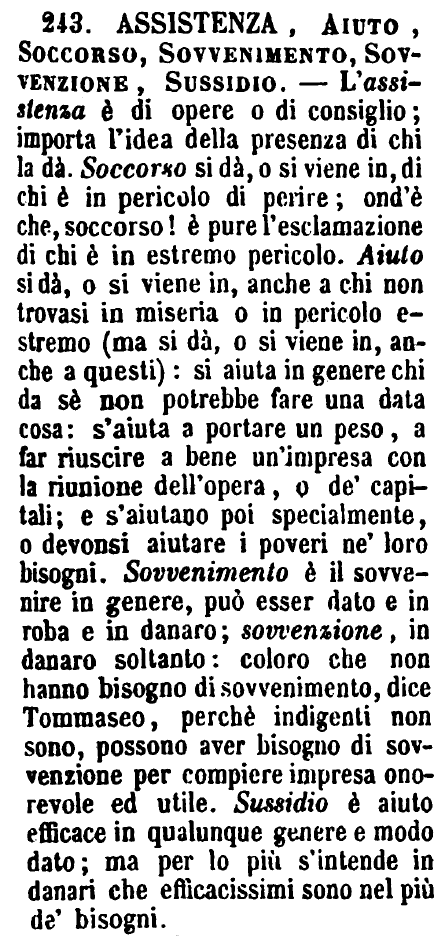 | Assistenza, Aiuto, Soccorso, Sovvenimento, Sovvenzione, Sussidio - L'assistenza è di opere o di consiglio; importa l'idea della presenza di chi la dà. Soccorso si dà, o si viene in, di chi è in pericolo di perire; ond'è che, soccorso! è pure l'esclamazione di chi è in estremo pericolo. Aiuto si dà, o si viene in, anche a chi non trovasi in miseria o in pericolo estremo (ma si dà, o si viene in, anche a questi): si aiuta in genere chi da sè non potrebbe fare una data cosa: s'aiuta a portare un peso, a far riuscire a bene un'impresa con la riunione dell'opera, o de' capitali; e s'aiutano poi specialmente, o devonsi aiutare i poveri ne' loro bisogni. Sovvenimento è il sovvenire in genere, può esser dato e in roba e in danaro; sovvenzione, in danaro soltanto: coloro che non hanno bisogno di sovvenimento, dice Tommaseo, perchè indigenti non sono, possono aver bisogno di sovvenzione per compiere impresa onorevole ed utile. Sussidio è aiuto efficace in qualunque genere e modo dato; ma per lo più s'intende in danari che efficacissimi sono nel più de' bisogni. [immagine] |