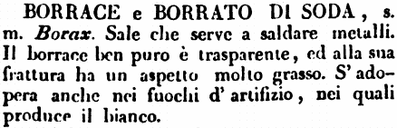 | Borrace e Borrato di soda - s. m. Borax. Sale che serve a saldare metalli. Il borrace ben puro è trasparente, ed alla sua frattura ha un aspetto molto grasso. S'adopera anche nei fuochi d'artifizio, nei quali produce il bianco. [immagine] |