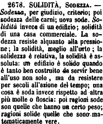 Sodezza - S. f. Qualità di ciò che è sodo; Durezza. Soliditas, aureo. [Cont.] Pall. A. Arch. I. 7. Se 'l terren sarà sodo e fermo, tanto in quello si caverà sotto quanto parerà al giudizioso architetto che richieda la qualità della fabbrica, e la sodezza di esso terreno. Vas. Arch. III. Palazzi i quali, per la sodezza e collegazione delle pietre, sono durati e mantenuti più che non hanno fatto tutti gli altri edificii. = Cr. 2. 8. 9. (C) Per la sodezza sua ritiene più natural colore. E num. 10. L'umore più lungamente dimora in cotal modo, sì per la tortezza, e sì ancora per la sodezza. Vegez. 154. I quali per la sodezza sono più gravi, e acconci a gittare. Baldin. Voc. Dis. 153. (Man.) E questo chiamano (gli architetti) sodo del terreno, quantunque non sempre si trovi della medesima sodezza. [G.M.] Segner. Mann. Marz. 9. Un principe, per risolvere se una moneta si abbia da ammettere nel suo Stato, che fa? Si contenta della apparenza? Non già: la fa gettare nel fuoco; perciocchè quivi subito si vedrà se corrisponde alla beltà la sodezza. E Quares. 14. 1. Gran Dio che avete in vostra mano le chiavi di quelle porte, alla cui sodezza non v'è diaspro nè diamante da mettersi in paragone, deh! vi piaccia un poco prestarmele per breve ora (le chiavi delle porte dell'inferno).
