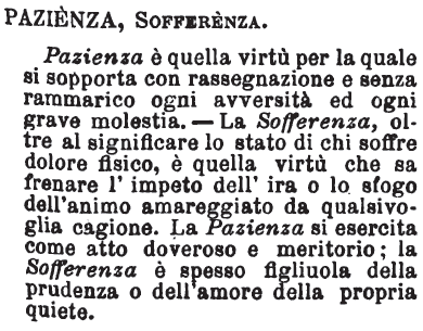 | Pazienza, Sofferenza - Pazienza è quella virtù per la quale si sopporta con rassegnazione e senza rammarico ogni avversità ed ogni grave molestia. - La Sofferenza, oltre al significare lo stato di chi soffre dolore fisico, è quella virtù che sa frenare l'impeto dell'ira o lo sfogo dell'animo amareggiato da qualsivoglia cagione. La Pazienza si esercita come atto doveroso e meritorio; la Sofferenza è spesso figliuola della prudenza o dell'amore della propria quiete. [immagine] |