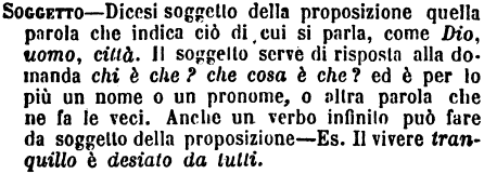 | Soggetto - Dicesi soggetto della proposizione quella parola che indica ciò di cui si parla, come Dio, uomo, città. Il soggetto serve di risposta alla domanda chi è che? che cosa è che? ed è per lo più un nome o un pronome, o altra parola che ne fa le veci. Anche un verbo infinito può fare da soggetto della proposizione - Es. Il vivere tranquillo è desiato da tutti. [immagine] |