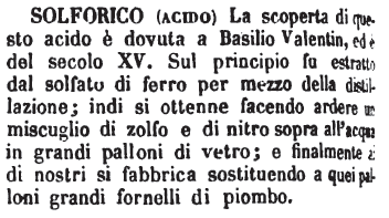 | Solforico (Acido) - La scoperta di questo acido è dovuta a Basilio Valentin, ed è del secolo XV. Sul principio fu estratto dal solfato di ferro per mezzo della distillazione; indi si ottenne facendo ardere un miscuglio di zolfo e di nitro sopra all'acqua in grandi palloni di vetro; e finalmente ai dì nostri si fabbrica sostituendo a quei palloni grandi fornelli di piombo. [immagine] |