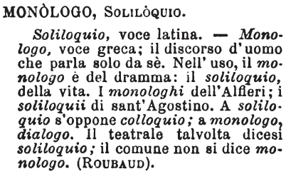 | Monologo, Soliloquio - «Soliloquio, voce latina: monologo, voce greca; il discorso d'uomo che parla solo da sè. Nell'uso, il monologo è del dramma; il soliloquio, della vita. I monologhi dell'Alfieri; i soliloquii di s. Agostino. A soliloquio s'oppone colloquio; a monologo, dialogo. Il teatrale talvolta dicesi soliloquio; il comune non si dice monologo». Roubaud. [immagine] |