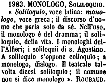 | Monologo, Soliloquio - Soliloquio, voce latina. - Monologo, voce greca; il discorso d'uomo che parla solo da sè. Nell'uso, il monologo è del dramma: il soliloquio, della vita. I monologhi dell'Alfieri; i soliloquii di sant'Agostino. A soliloquio s'oppone colloquio; a monologo, dialogo. Il teatrale talvolta dicesi soliloquio; il comune non si dice monologo. (Roubaud). [immagine] |