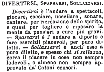 | Divertirsi, Spassarsi, Sollazzarsi - Divertirsi è l'andare a spettacoli, giocare, cacciare, uccellare, sonare, cantare, per ricreazione dello spirito, e quasi per togliere e riposare la mente da pensieri e cure più gravi. - Spassarsi è l' andare a diporto e fare esercizii piacevoli, per puro diletto. - Sollazzarsi è anch' esso a puro diletto, e spesso chi si sollazza, cerca il piacere in cose non sempre lodevoli, o almeno non sempre approvate da' Catoni censori. [immagine] |