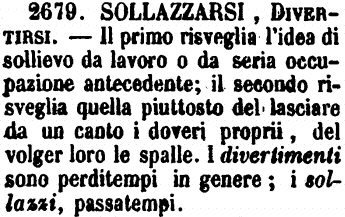 | Sollazzarsi, Divertirsi - Il primo risveglia l'idea di sollievo da lavoro o da seria occupazione antecedente; il secondo risveglia quella piuttosto del lasciare da un canto i doveri proprii, del volger loro le spalle. I divertimenti sono perditempi in genere; i sollazzi, passatempi. [immagine] |