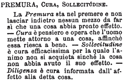 | Premura, Cura, Sollecitudine - La Premura sta nel premere e non lasciar indietro nessun mezzo da far sì che una cosa abbia pronto effetto.-Cura è pensiero e opera che l'uomo mette attorno a una cosa, affinchè essa riesca a bene.-Sollecitudine è cura efficacissima per la quale l'animo non si acquieta sinchè la cosa non abbia avuto il suo effetto.-Diligenza è cura informata dall'affetto alla detta cosa. [immagine] |