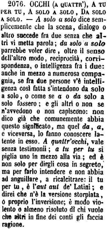 | Occhi (a quattr'), A tu per tu, A solo a solo, Da solo a solo - A solo a solo dice semplicemente che la scena, dialogo o altro succede fra due senza che altri vi metta parola; da solo a solo parrebbe voler dire, oltre il senso dell’altro modo, reciprocità, corrispondenza, o intelligenza fra i due: anche in mezzo a numerosa compagnia, se fra due persone v’è intelligenza così fatta s’intendono da solo a solo, o come se a o da solo a solo fossero; e gli altri o non se n’avvedono o non capiscono: non dico già che comunemente abbia questo significato, ma quel da, a, e viceversa, lo fanno conoscere latente in esso. A quattr’occhi, vale senza testimonii; a tu per tu si piglia uno in mezzo alla via; ed è non solo per dirgli cosa in segreto, ma per farlo intendere e non abbia ad anguillare, a ricalcitrare: il tu per tu, è l’aut aut de' Latini; e direi che n’è la versione storpiata, o proprio l’inversione; è modo violento o almeno risoluto di chi vuole che altri in fine dei conti gli faccia ragione. [immagine] |