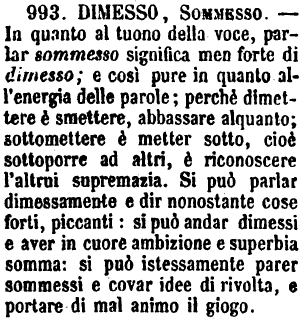 | Dimesso, Sommesso - In quanto al tuono della voce, parlar sommesso significa men forte di dimesso; e così pure in quanto all'energia delle parole; perchè dimettere è smettere, abbassare alquanto; sottomettere è metter sotto, cioè sottoporre ad altri, è riconoscere l'altrui supremazia. Si può parlar dimessamente e dir nonostante cose forti, piccanti: si può andar dimessi e aver in cuore ambizione e superbia somma: si può istessamente parer sommessi e covar idee di rivolta, e portare di mal animo il giogo. [immagine] |