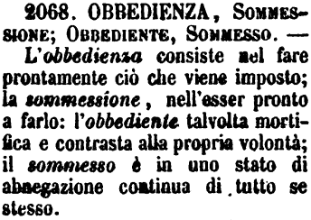 | Obbedienza, Sommessione, Obbediente, Sommesso - L'obbedienza consiste nel fare prontamente ciò che viene imposto; la sommessione, nell'esser pronto a farlo; l'obbediente talvolta mortifica e contrasta alla propria volontà; il sommesso è in uno stato di abnegazione continua di tutto se stesso. [immagine] |
