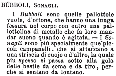 | Bubboli, Sonagli - I Bubboli sono quelle pallottole vuote, d'ottone, che hanno una lunga fessura nel corpo con entro una pallottolina di metallo che fa loro mandar suono quando è agitata. - I Sonagli sono più specialmente que' piccoli campanelli, che si attaccano a una striscia di cuojo o d'altro, la quale più spesso si passa sotto alla gola delle bestie da soma o da tiro, perchè si sentano da lontano. [immagine] |
