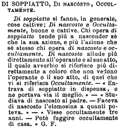| Di soppiatto, Di nascosto, Occultamente - Di soppiatto si fanno, in generale, cose cattive; Di nascosto e Occultamente, buone e cattive. Chi opera di soppiatto tende più a nasconder sè che la sua azione, e più l'azione che sè stesso chi opera di nascosto e occultamente. Di nascosto allude più direttamente all'operante e al suo atto, il quale avverbio si riferisce più direttamente a coloro che non vedono l'operante o il suo atto, di quel che vi si riferisca Occultamente. - «Entrava di soppiatto in dispensa, e ne portava via il meglio.» - «Studiava di nascosto al padre. - Faceva di nascosto l'elemosita a quanti poteva.» - «Visse occultamente tre anni. - Potè fuggire occultamente di casa.» G. F. [immagine] |