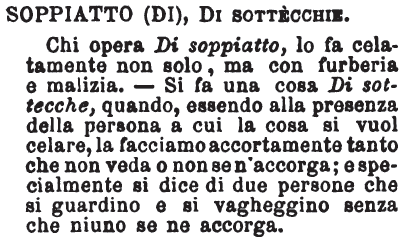 | Soppiatto (di), Di sottecchie - Chi opera Di soppiatto, lo fa celatamente non solo, ma con furberia e malizia. - Si fa una cosa Di sottecche, quando, essendo alla presenza della persona a cui la cosa si vuol celare, la facciamo accortamente tanto che non veda o non se n'accorga; e specialmente si dice di due persone che si guardino e si vagheggino senza che niuno se ne accorga. [immagine] |