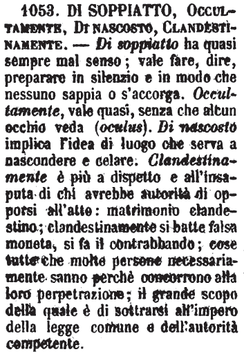 | Di soppiatto, Occultamente, Di nascosto, Clandestinamente - Di soppiatto ha quasi sempre mal senso; vale fare, dire, preparare in silenzio e in modo che nessuno sappia o s'accorga. Occultamente, vale quasi, senza che alcun occhio veda (oculus). Di nascosto implica l'idea di luogo che serva a nascondere e celare. Clandestinamente è più a dispetto e all'insaputa di chi avrebbe autorità di opporsi all'atto: matrimonio clandestino; clandestinamente si batte falsa moneta, si fa il contrabbando; cose tutte che molte persone necessariamente sanno perchè concorrono alla loro perpetrazione; il grande scopo della quale è di sottrarsi all'impero della legge comune e dell'autorità competente. [immagine] |