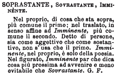 | Soprastante, Sovrastante, Imminente - Nel proprio, di cosa che sta sopra, più comune il primo; nel traslato, in senso affine ad Imminente, più comune il secondo. Detto di persone, sia come aggettivo che come sostantivo, non s'usa che il primo. Imminente, nel proprio, è solo della poesia. Nel figurato, Imminente par che dica cosa più prossima ad avvenire e meno evitabile che Sovrastante. G. F. [immagine] |