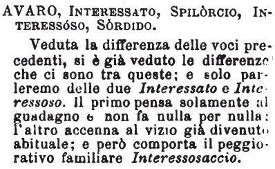 | Avaro, Interessato, Spilorcio, Interessoso, Sordido - Veduta la differenza delle voci precedenti, si è già veduto le differenze che ci sono tra queste; e solo parleremo delle due Interessato e Interessoso. Il primo pensa solamente al guadagno e non fa nulla per nulla; l'altro accenna al vizio già divenuto abituale; e però comporta il peggiorativo familiare Interessosaccio. [immagine] |