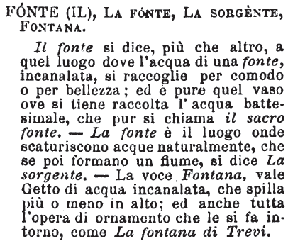 | Fonte (il), La fonte, La sorgente, Fontana - Il fonte si dice, più che altro, a quel luogo dove l'acqua di una fonte, incanalata, si raccoglie per comodo o per bellezza; ed è pure quel vaso ove si tiene raccolta l'acqua battesimale, che pur si chiama il sacro fonte. - La fonte è il luogo onde scaturiscono acque naturalmente, che se poi formano un fiume, si dice La sorgente. - La voce Fontana, vale Getto di acqua incanalata, che spilla più o meno in alto; ed anche tutta l'opera di ornamento che le si fa intorno, come La fontana di Trevi. [immagine] |