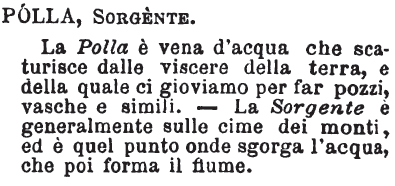 | Polla, Sorgente - La Polla è vena d'acqua che scaturisce dalle viscere della terra, e della quale ci gioviamo per far pozzi, vasche e simili. - La Sorgente è generalmente sulle cime dei monti, ed è quel punto onde sgorga l'acqua, che poi forma il fiume. [immagine] |