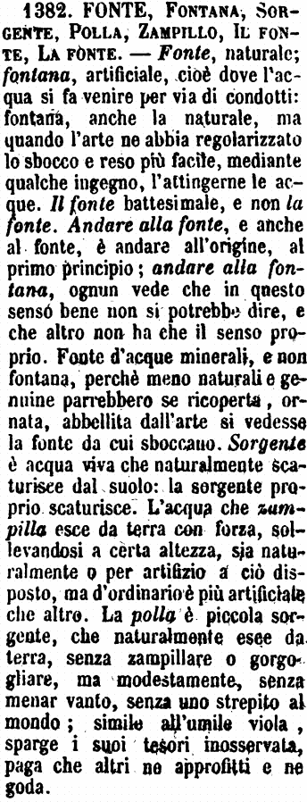 | Fonte, Fontana, Sorgente, Polla, Zampillo, Il fonte, La fonte - Fonte, naturale; fontana, artificiale, cioè dove l'acqua si fa venire per via di condotti: fontana, anche la naturale, ma quando l'arte ne abbia regolarizzato lo sbocco e reso più facile, mediante qualche ingegno, l'attingerne le acque. Il fonte battesimale, e non la fonte. Andare alla fonte, e anche al fonte, è andare all'origine, al primo principio; andare alla fontana, ognun vede che in questo senso bene non si potrebbe dire, e che altro non ha che il senso proprio. Fonte d'acque minerali, e non fontana, perchè meno naturali e genuine parrebbero se ricoperta, ornata, abbellita dall'arte si vedesse la fonte da cui sboccano. Sorgente è acqua viva che naturalmente scaturisce dal suolo: la sorgente proprio scaturisce. L'acqua che zampilla esce da terra con forza, sollevandosi a certa altezza, sia naturalmente o per artifizio a ciò disposto, ma d'ordinario è più artificiale che altro. La polla è piccola sorgente, che naturalmente esce da terra, senza zampillare o gorgogliare, ma modestamente, senza menar vanto, senza uno strepito al mondo; simile all'umile viola, sparge i suoi tesori inosservata, paga che altri ne approfitti e ne goda. [immagine] |