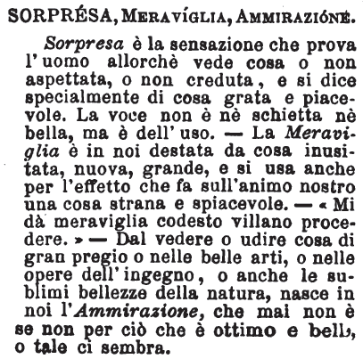| Sorpresa, Meraviglia, Ammirazione - Sorpresa è la sensazione che prova l'uomo allorchè vede cosa o non aspettata, o non creduta, e si dice specialmente di cosa grata e piacevole. La voce non è nè schietta nè bella, ma è dell'uso. - La Meraviglia è in noi destata da cosa inusitata, nuova, grande, e si usa anche per l'effetto che fa sull'animo nostro una cosa strana e spiacevole. - «Mi dà meraviglia codesto villano procedere.» - Dal vedere o udire cosa di gran pregio o nelle belle arti, o nelle opere dell'ingegno, o anche le sublimi bellezze della natura, nasce in noi l'Ammirazione, che mai non è se non per ciò che è ottimo e bello, o tale ci sembra. [immagine] |