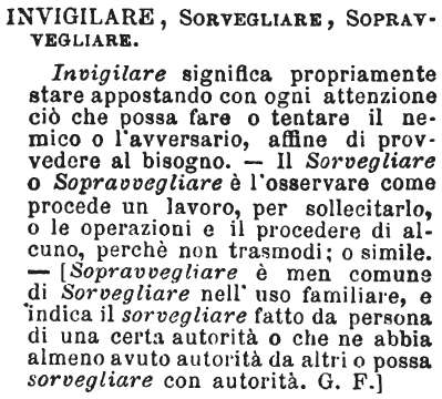 | Invigilare, Sorvegliare, Sopravvegliare - Invigilare significa propriamente stare appostando con ogni attenzione ciò che possa fare o tentare il nemico o l'avversario, affine di provvedere al bisogno. - Il Sorvegliare o Sopravvegliare è l'osservare come procede un lavoro, per sollecitarlo, o le operazioni e il procedere di alcuno, perchè non trasmodi; o simile. - [Sopravvegliare è men comune di Sorvegliare nell'uso familiare, e indica il sorvegliare fatto da persona di una certa autorità o che ne abbia almeno avuto autorità da altri o possa sorvegliare con autorità. G. F.] [immagine] |