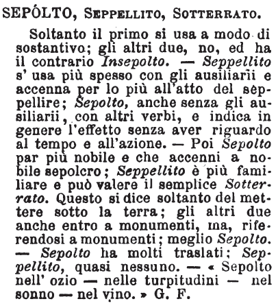 | Sepolto, Seppellito, Sotterrato - Soltanto il primo si usa a modo di sostantivo; gli altri due, no, ed ha il contrario Insepolto. - Seppellito s'usa più spesso con gli ausiliarii e accenna per lo più all'atto del seppellire; Sepolto, anche senza gli ausiliarii, con altri verbi, e indica in genere l'effetto senza aver riguardo al tempo e all'azione. - Poi Sepolto par più nobile e che accenni a nobile sepolcro; Seppellito è più familiare e può valere il semplice Sotterrato. Questo si dice soltanto del mettere sotto la terra; gli altri due anche entro a monumenti, ma, riferendosi a monumenti; meglio Sepolto. - Sepolto ha molti traslati; Seppellito, quasi nessuno. - « Sepolto nell'ozio - nelle turpitudini - nel sonno - nel vino. » G. F. [immagine] |