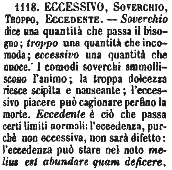 | Eccessivo, Soverchio, Troppo, Eccedente - Soverchio dice una quantità che passa il bisogno; troppo una quantità che incomoda; eccessivo una quantità che nuoce. I comodi soverchi ammolliscono l'animo; la troppa dolcezza riesce scipìta e nauseante; l'eccessivo piacere può cagionare perfino la morte. Eccedente è ciò che passa certi limiti normali: l'eccedenza, purchè non eccessiva, non sarà difetto: l'eccedenza può stare nel noto melius est abundare quam deficere. [immagine] |