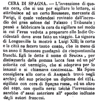 | Cera di spagna - L'invenzione di questa cera, che si usa per sigillare le lettere, si attribuisce ad un certo Rousseau, mercante di Parigi, il quale vedendosi rovinato dall'incendio del gran salone del palazzo (Tribunale) pensò a fabbricare la cera da sigillare nel modo in cui l'avea veduta a preparare alle Indie Occidentali dove avea fatto un viaggio. La signora di Longueville la mostrò a Luigi XIII; la corte e la città ne fecero tanto conto, che in meno di un anno il Rousseau guadagnò da cinquantamila franchi. Egli le dette il nome di Spagna, per distinguerla dalla gomma lacca fusa ed un pò' colorita col vermigiio, che si adoprava per lo innanzi e si chiamava cocciniglia. Ma Spies consigliere alla corte di Anspach trovò negli archivij del suo principe un diploma del 1574. sigillato con cera di Spagna rossa, ed un altro del 1620. con quella nera: talchè l'invenzione sarebbe d'assai anteriore all'epoche indicate dagli autori francesi. [immagine] |