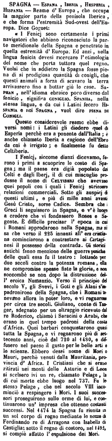 «I Fenicj sono certamente i primi navigatori che abbiano riconosciuto la parte meridionale della Spagna e penetrato in quella estremità d'Europa. Ed anzi, nella lingua fenicia devesi ricercare l'etimologia del nome che porta tuttora quel regno. Vuolsi che in addietro la Spagna fosse piena di si prodigiosa quantità di conigli, che questi animali a forza di scavare la terra arrivassero fino a buttar giù le case. Saphan, nell'idioma ebraico poco diverso dal fenicio, significa coniglio. Spanha, nella stessa lingua, e da cui i Latini fecero Hispania e noi Spagna, vuol dire piena di Conigli. Questo considerevole reame ebbe diversi nomi: i Latini gli diedero quel di Esperia perché era a ponente dall'Italia; è anche chiamato Iberia a cagione dell'Ebro da cui è irrigato; e finalmente fu detto Celtiberia. I Fenicj, siccome dianzi dicevamo, furono i primi a scuoprire le coste di Spagna; ma il paese era digià popolato dai Celti e dagli Iberj, il di cui miscuglio produsse il nome di Celtiberj che avevano quei popoli con i quali i Fenicj strinsero relazioni commerciali. Sotto gli auspicj di questi ultimi, e più di mille anni avanti Gesù Cristo, sorse Cadice. Sembra che i Greci li seguissero in Spagna, e v'è luogo a credere che vi fondassero Roses e Sagonte. E' difficile precisar l'epoca in cui i Romani approdarono nella Spagna, ma si sa che verso il 225 innanzi all'era cristiana cominciarono a contrastare ai Cartaginesi il possesso della contrada. Gli storici antichi fanno menzione delle guerre puniche delle quali essa fu il teatro: lottando per due secoli contro la potenza romana, ella ne compromise spesse fiate la gloria, e non soccombè se non dopo la distruzione dell'eroica Numanzio. Verso il principio del secolo V, gli Svevi, i Goti e gli Alani s'impadronirono della Spagna, che i Romani tenevano allora in poter loro, e vi regnarono per circa tre secoli. Giuliano, conte di Tanger, sdegnato per un oltraggio ricevuto dal re Roderico, chiamò i Saracini o Arabi, che erano in quel tempo padroni della costa d'Africa. Quei barbari conquistarono quasi tutta la Spagna, e vi regnarono più di settecento anni, cioè dal 720 al 1480, e diffusero nel paese il gusto per le belle arti e le scienze. Ebbero dessi nome di Mori o Mauri, perché venuti dalla Mauritania, provincia d'Africa. I Cristiani che si erano ritirati nei monti delle Asturie e di Leon si scelsero ivi un re, chiamato Pelage, la di cui morte ebbe luogo nel 737. Fu lo stesso Pelage, che nel secolo VIII incominciò a respingere i Mori. I suoi successori proseguirono sulle orme di lui, e continuarono un'impresa che ottenne costanti successi. Nel 1474 la Spagna fu riunita in un sol corpo di regno mediante le nozze di Ferdinando re di Arragona con Isabella di Castiglia; sotto il regno di costoro, nel 1492, si compiè affatto l'espulsione dei Mori. [immagine] |