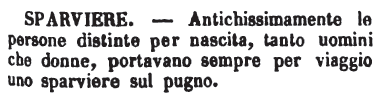 | Sparviere - Antichissimamente le persone distinte per nascita, tanto uomini che donne, portavano sempre per viaggio uno sparviere sul pugno. [immagine] |