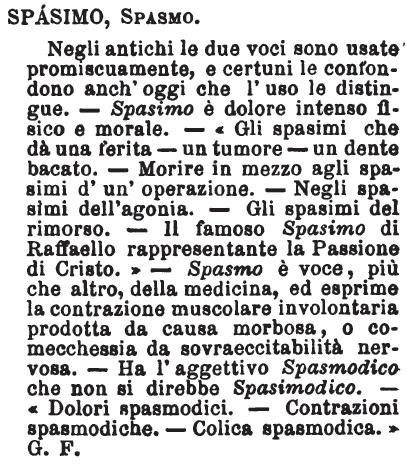 | Spasimo, Spasmo - Negli antichi le due voci sono usate promiscuamente, e certuni le confondono anch'oggi che l'uso le distingue. - Spasimo è dolore intenso fisico e morale. - «Gli spasimi che dà una ferita - un tumore - un dente bacato. - Morire in mezzo agli spasimi d'un'operazione. - Negli spasimi all'agonia. - Gli spasimi del rimorso. - Il famoso Spasimo di Raffaello rappresentante la Passione di Cristo.» - Spasmo è voce, più che altro, della medicina, ed esprime la contrazione muscolare involontaria prodotta da causa morbosa, o comecchessia da sovraeccitabilità nervosa. - Ha l'aggettivo Spasmodico che non si direbbe Spasimodico. - «Dolori spasmodici. - Contrazioni spasmodiche. - Colica spasmodica.» G. F. [immagine] |