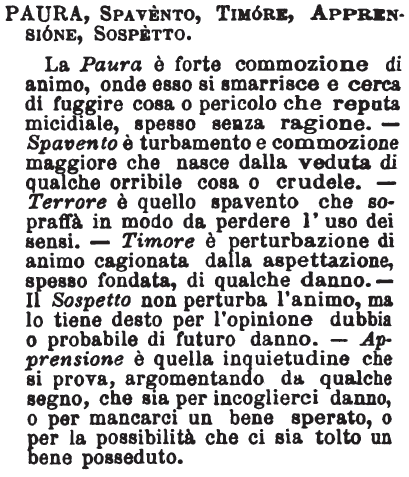 | Paura, Spavento, Timore, Apprensione, Sospetto - La Paura è forte commozione di animo, onde esso si smarrisce e cerca di fuggire cosa o pericolo che reputa micidiale, spesso senza ragione. - Spavento è turbamento e commozione maggiore che nasce dalla veduta di qualche orribile cosa o crudele. - Terrore è quello spavento che sopraffà in modo da perdere l'uso dei sensi. - Timore è perturbazione di animo cagionata dalla aspettazione, spesso fondata, di qualche danno. - Il Sospetto non perturba l'animo, ma lo tiene desto per l'opinione dubbia o probabile di futuro danno. - Apprensione è quella inquietudine che si prova, argomentando da qualche segno, che sia per incoglierci danno, o per mancarci un bene sperato, o per la possibilità che ci sia tolto un bene posseduto. [immagine] |