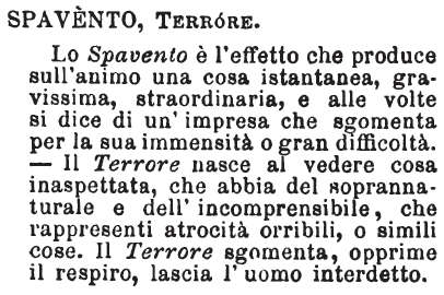 | Spavento, Terrore - Lo Spavento è l'effetto che produce sull'animo una cosa istantanea, gravissima, straordinaria, e alle volte si dice di un'impresa che sgomenta per la sua immensità o gran difficoltà. - Il Terrore nasce al vedere cosa inaspettata, che abbia del soprannaturale e dell'incomprensibile, che rappresenti atrocità orribili, o simili cose. Il Terrore sgomenta, opprime il respiro, lascia l'uomo interdetto. [immagine] |