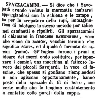| Spazzacamini - Si dice che i Savojardi avendo veduto la marmotta inalzarsi appoggiandosi con la schiena e le zampe, su per le crepature delle rupi, immaginarono di adottare lo stesso metodo per salire nei caminetti e ripulirli. Gli spazzacamini si chiamano in francese ramoneurs, voce che viene da ramon, vecchio termine che significa scopa, ed il quale è formato da ramus (ramo). Gl'Inglesi furono i primi a ideare dei mezzi onde sostituire, per ispazzare i camini, una macchina al faticoso lavoro dei piccoli Savojardi. In vece di fascine, che spesso si gonfiano riempiendosi e non agiscono opportunamente, hanno posto delle spazzole di fil di ferro, con certe molle che le tengono costantemente a contatto colle pareti della cappa. [immagine] |