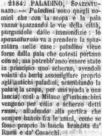 | Paladino, Spazzaturaio - Paladini sono quegli uomini che con la scopa e la pala vanno spazzando le vie della città, purgandole dalle immondizie: lo spazzaturaio va a prendere la spazzatura nelle case: paladino viene forse dalla pala che cotesti portano con sè; ma potrebb'anco essere stato in principio uno scherzo, avendoli voluti da burla assomigliare proprio agli antichi paladini, scambiando la pala e la scopa, per una spada e una lancia; così a Milano gl'imbianchini vengono per celia e scherzo detti russi, alludendo alla pertica che sempre hanno fra le mani, come se fosse proprio la lancia brandita da' Russi e da' Cosacchi. [immagine] |