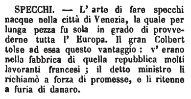 | Specchi - L'arte di fare specchi nacque nella città di Venezia, la quale per lunga pezza fu sola in grado di provvederne tutta l'Europa. Il gran Colbert tolse ad essa questo vantaggio: v'erano nella fabbrica di quella repubblica molti lavoranti francesi; il detto ministro li richiamò a forza di promesse, e li ritenne a furia di danaro. [immagine] |