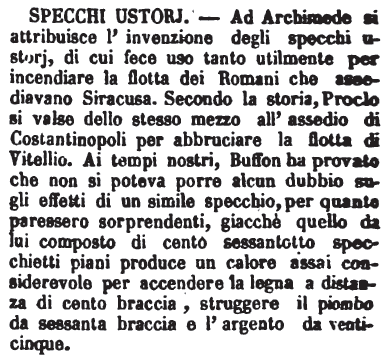 | Specchi ustorj - Ad Archimede si attribuisce l'invenzione degli specchi ustorj, di cui fece uso tanto utilmente per incendiare la flotta dei Romani che assediavano Siracusa. Secondo la storia, Proclo si valse dello stesso mezzo all'assedio di Costantinopoli per abbruciare la flotta di Vitellio. Ai tempi nostri, Buffon ha provato che non si poteva porre alcun dubbio sugli effetti di un simile specchio, per quante paressero sorprendenti, giacchè quello da lui composto di cento sessantotto specchietti piani produce un calore assai considerevole per accendere la legna a distanza di cento braccia, struggere il piombo da sessanta braccia e l'argento da venticinque. [immagine] |